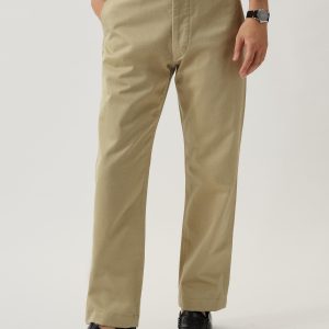 Inspired by 1960s military-issued chinos, an authentic period silhouette with a high rise, full top block, and a full leg. Cut from sulfur-dyed Japanese twill and constructed with busted seaming at the back rise, inseams, and outseams, along with tunnel belt loops and single-welt back pockets. Finished with corozo buttons, a Talon 42 zip, and a zip fly Stonewashed for a lived-in look and feel.