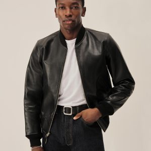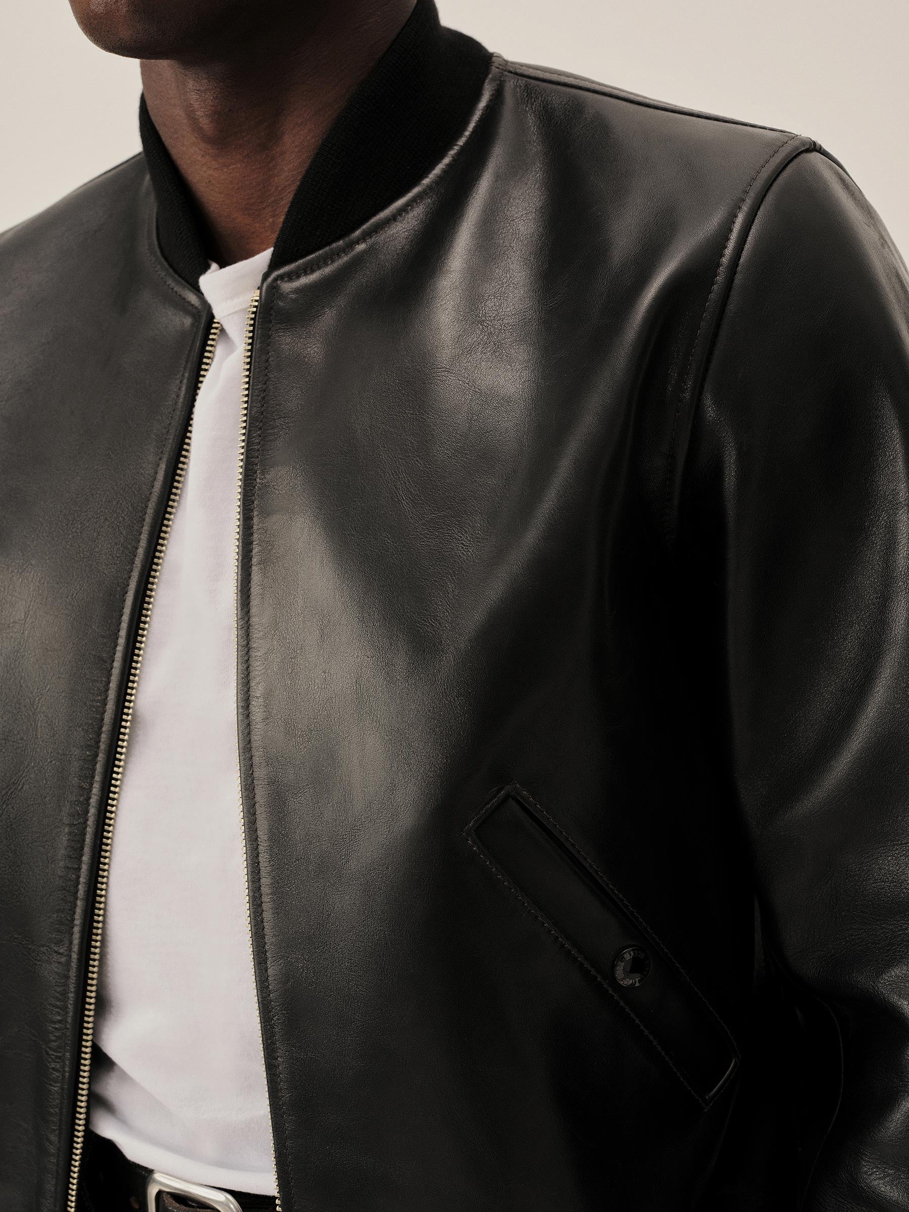 Vintage fit hand-cut bomber jacket in semi-vegetable tanned sheepskin. Two-stage dye process: first, the leather crust is dyed, then a second top dye is applied for a more natural patina. Details include angled zip pockets at the hips and cotton/wool ribbed cuffs and waistband with racking stitch detail. Features Bemberg™ lining. Garment washed, waxed, and hand-burnished for a lived-in feel.