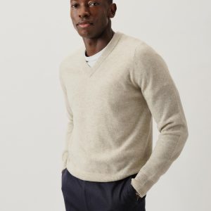 Classic fit long sleeve V-neck sweater in a 12 gauge jersey knit from yarn-dyed long staple cashmere. Fully-fashioned and finished with ribbing at the cuffs, collar, and hem. Constructed with hand-linked seams for durability.