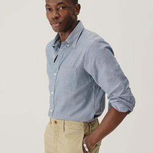 Classic fit button down collar shirt cut from a proprietary 3 oz blend of cotton and tencel. Details include mother of pearl buttons, a single scallop pocket, and a box pleat at the back. Constructed with clean finished seams. Garment washed for a lived-in look and feel.