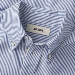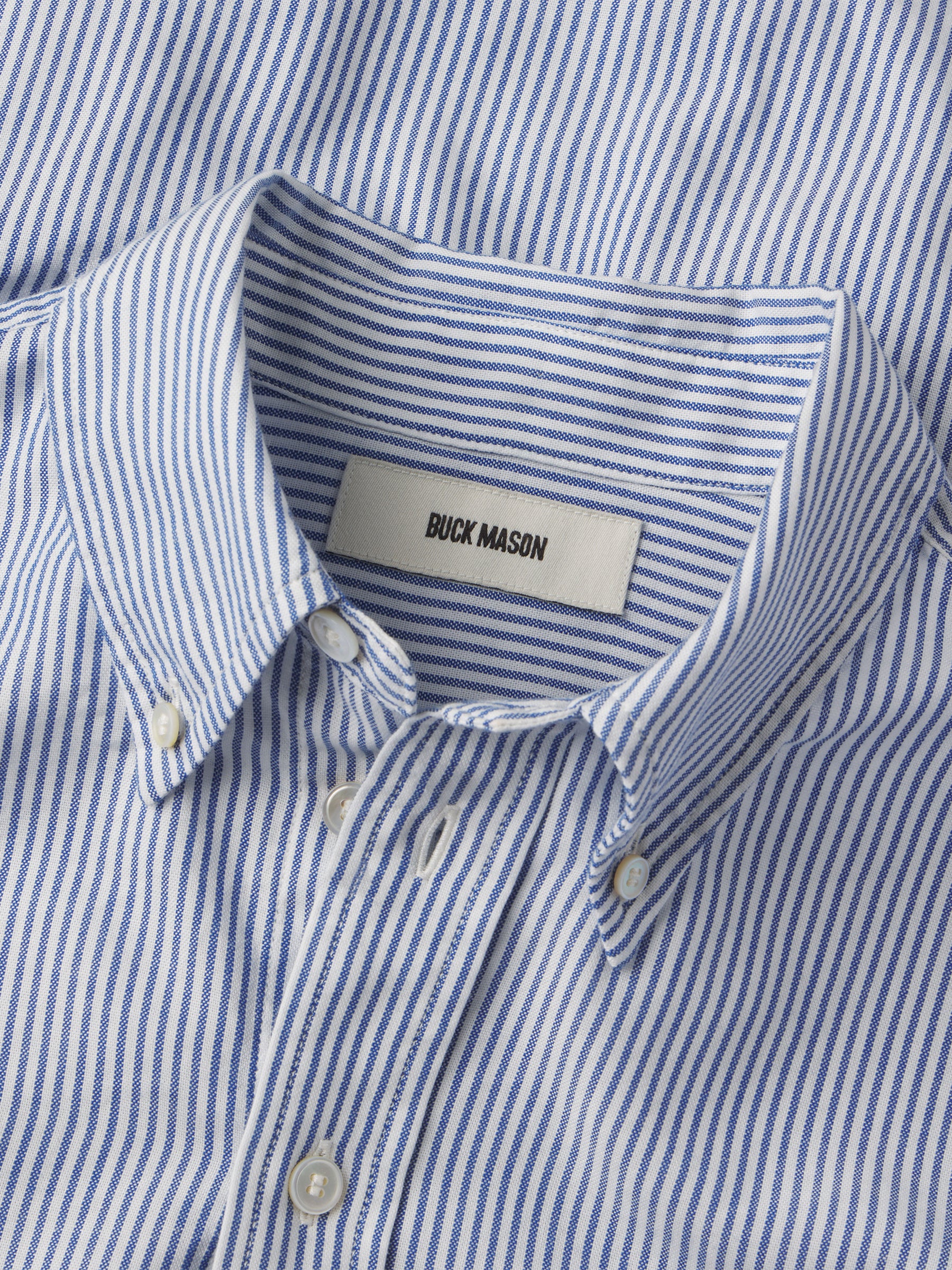 Inspired by 1950s men’s dress shirts, an Oxford cut from a natural, yarn-dyed fiber blend with a soft hand and crisp structure. Our slimmest shirt yet, it’s designed with a button-down collar that holds the perfect roll, stacked mother-of-pearl buttons, and felled seams for durability. Details include knife pleats at the cuff, a box pleat at the back yoke, and a shrunken silhouette made to layer under a blazer or wear solo.