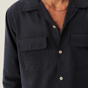 The Casita Camp Shirt channels the casual poise of 1950s and ’60s resort wear. Woven for warmer weather, the ultralight yarn-dyed Tencel brings a smooth, airy drape to cool summer nights. Designed with a period fit, a straight hem, side vents, and authentic details like a collar loop button fastener, patch-and-flap chest pockets, and real troca shell buttons. Finished with single-needle construction, a French placket, and a garment rinse for a soft, lived-in feel.
