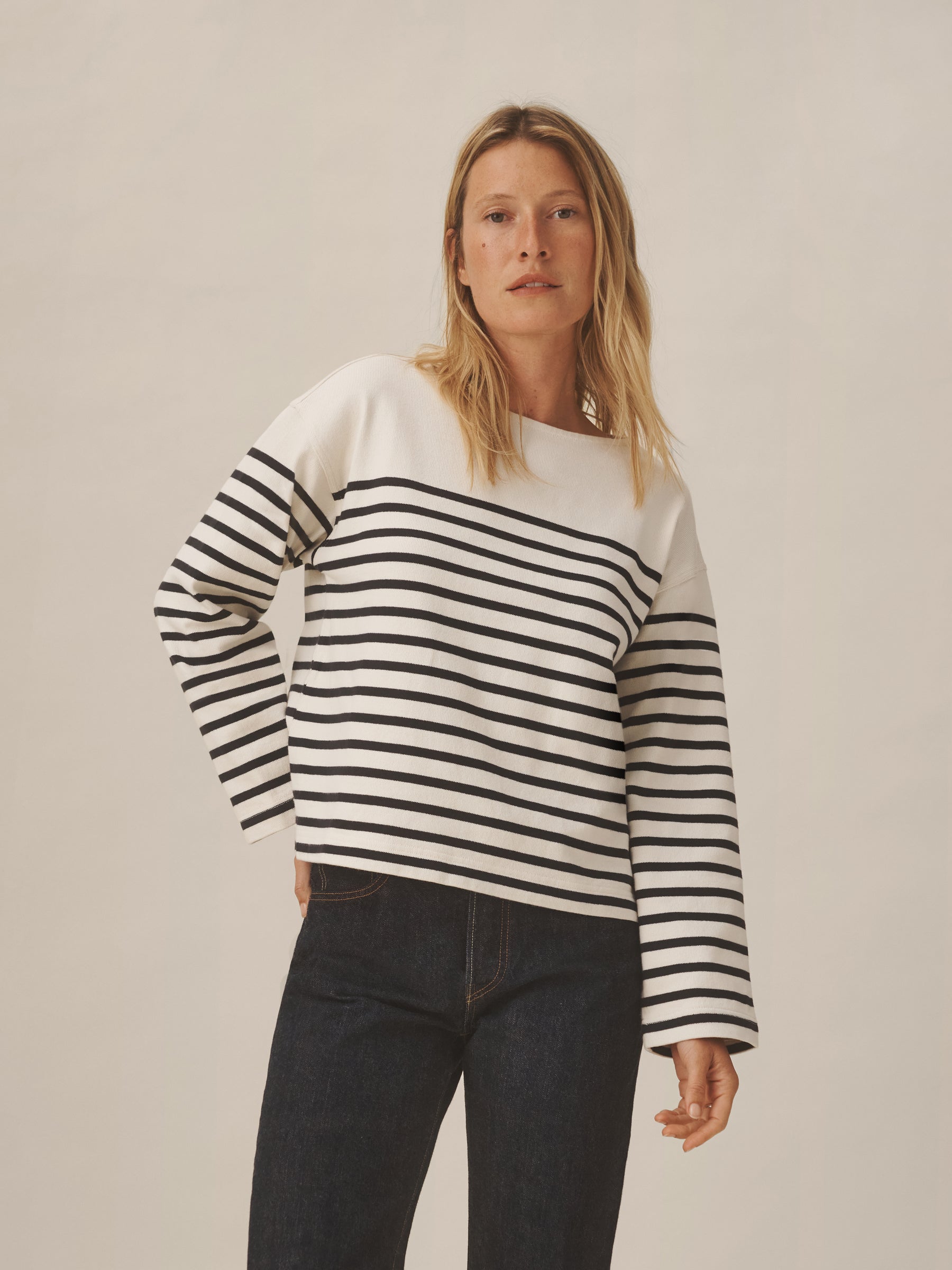 Relaxed long sleeve boatneck tee inspired by the classic French breton shirts. Cut from sturdy, compact 350 GSM cotton. Details include a taped boatneck neckline and side slits at the hem. Constructed with flatlock stitching throughout and double needle coverstitching at the hem. Garment washed for a lived-in feel.