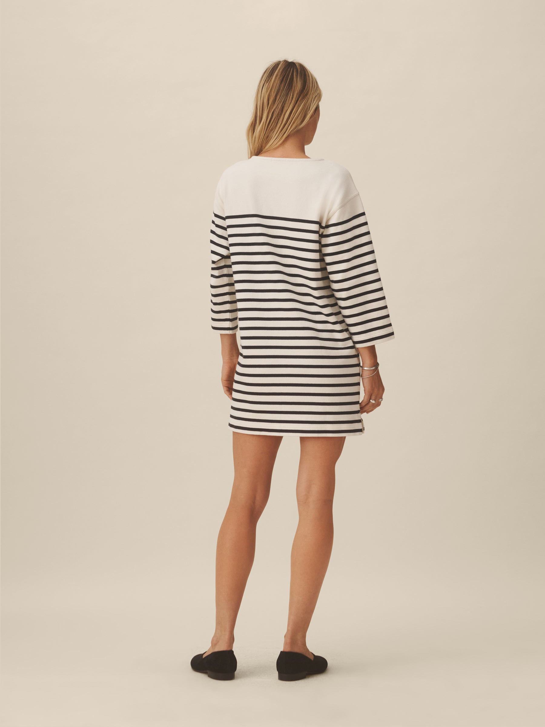 Inspired by classic French Breton stripe shirts, a relaxed boatneck shift dress with long sleeves, made from heavy cotton jersey. Detailed with herringbone tape along the side slits and neckline and finished with a garment wash for a soft, broken-in feel.