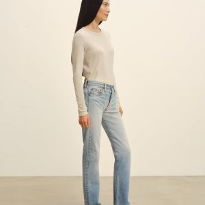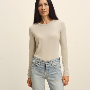 Slim fit long sleeve crewneck tee cut from a supersoft 130 GSM blend of bamboo, cotton, and wool. Features a straight hem, a self bound neck, and raised armholes that hug the contours of the shoulders. Garment washed for a lived-in feel.