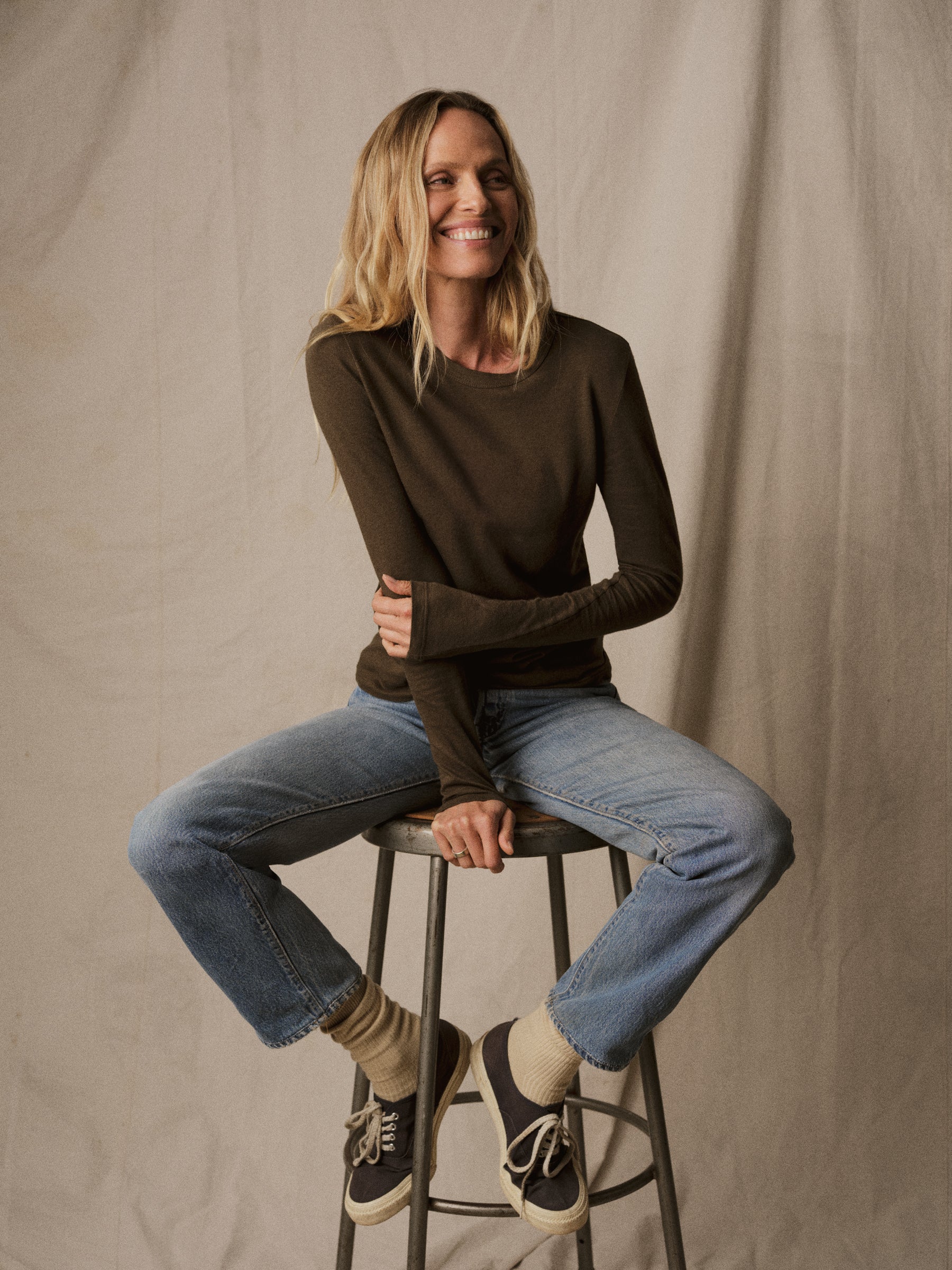Slim fit long sleeve crewneck tee cut from a supersoft 130 GSM blend of bamboo, cotton, and wool. Features a straight hem, a self bound neck, and raised armholes that hug the contours of the shoulders. Garment washed for a lived-in feel.