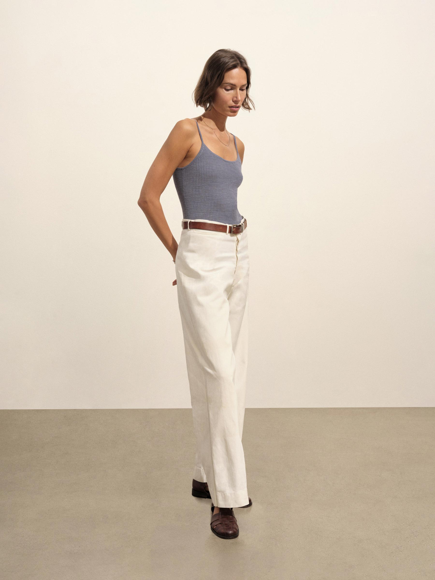 Slim fit, vintage-inspired camisole crafted from a delicate blend of Italian cotton and linen. Constructed from a structured 4×2 rib with a textured hand and a touch of stretch. Garment washed for vintage look and feel.