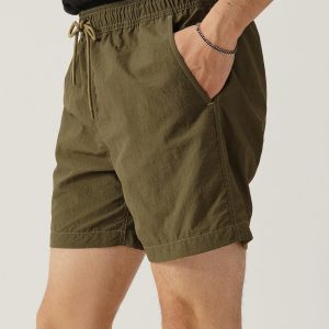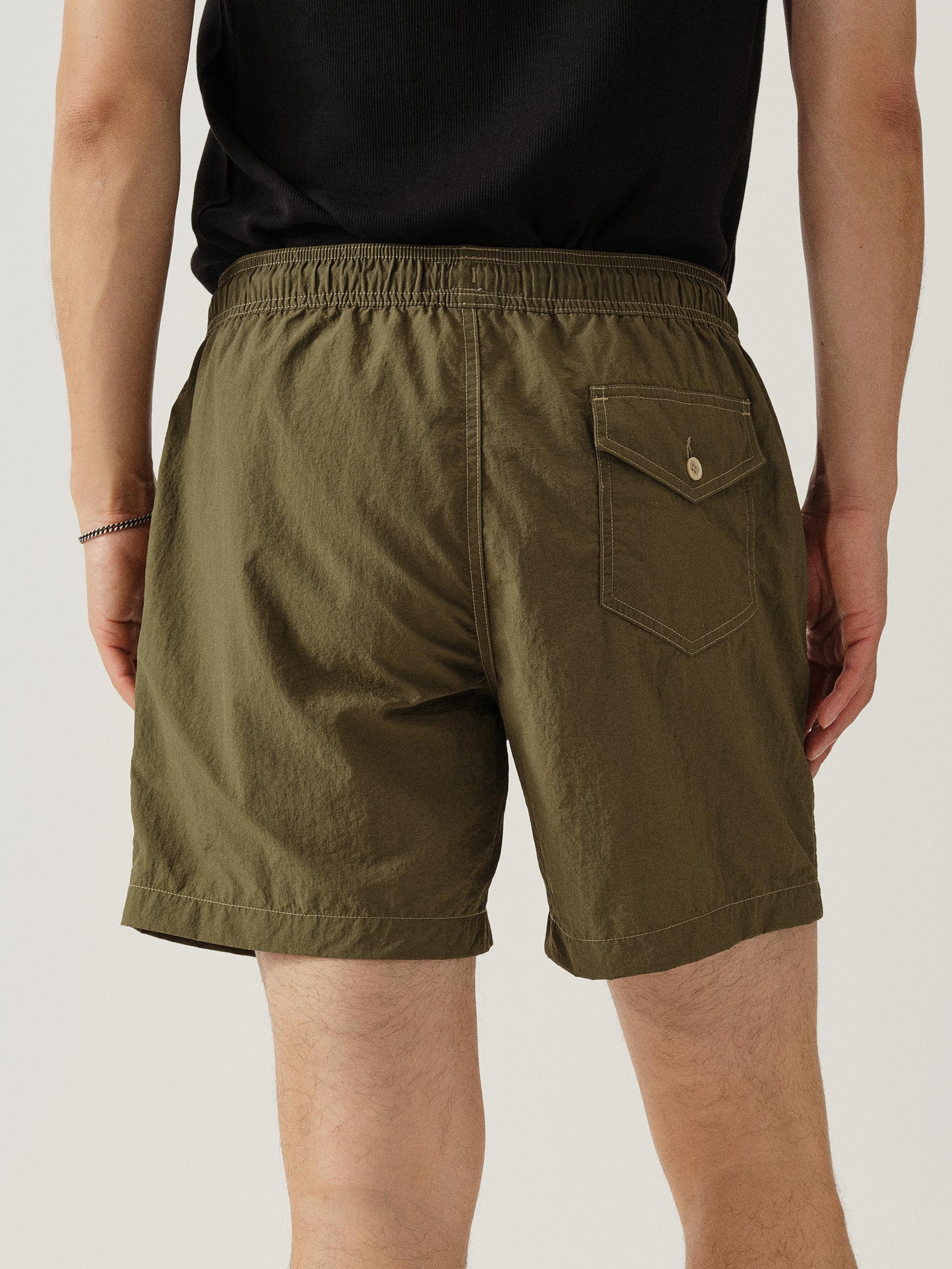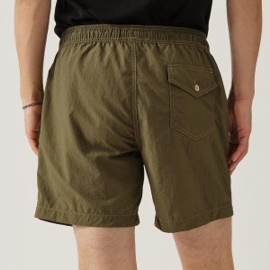 Classic swim shorts are made from lightweight woven nylon using recycled plastic waste found in the ocean. They feature an elastic waistband with an added drawstring for the perfect fit. A small front buttoned pocket and button flapped back pocket help you stow your necessaries in addition to two front slash pockets. 5.5-inch inseam.
