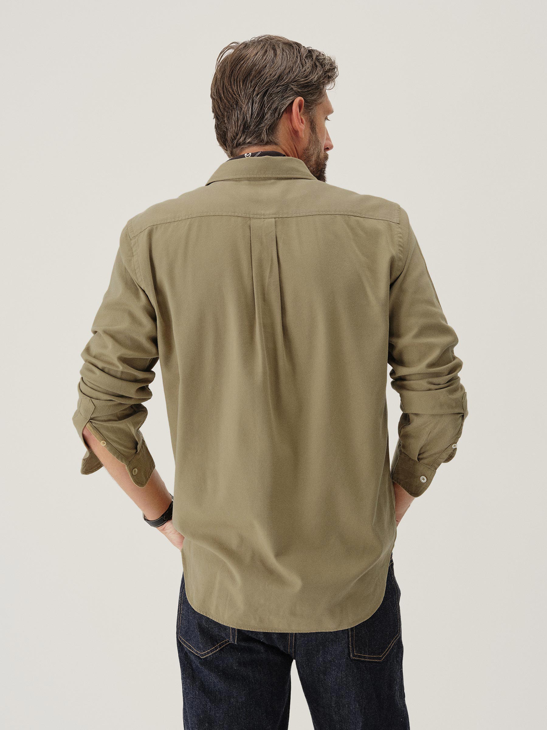 Slim fit long sleeve button up shirt in 5.25 oz. cotton/rayon twill with a subtle luster and an easy drape. Details include mother of pearl buttons, a single spade pocket at the chest, and a box pleat at the back yoke. Constructed with single needle topstitch detailing with double needle stitching at the collar and cuffs. Garment washed with softener for a lived-in feel.