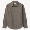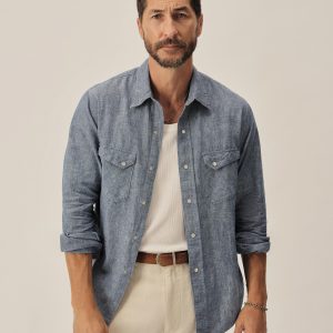 Slim fit long sleeve button up shirt in 5.25 oz. cotton/rayon twill with a subtle luster and an easy drape. Details include mother of pearl buttons, a single spade pocket at the chest, and a box pleat at the back yoke. Constructed with single needle topstitch detailing with double needle stitching at the collar and cuffs. Garment washed with softener for a lived-in feel.