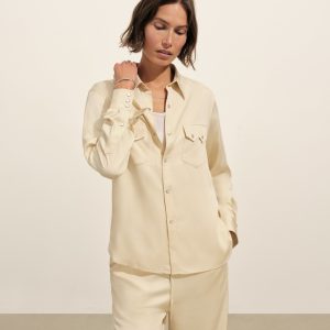 A silky, mid-century-inspired Western shirt with a relaxed body, distinct sawtooth pockets, and an arched back yoke with pleats. Cut from rayon modal and finished with French seams and pearl snaps.