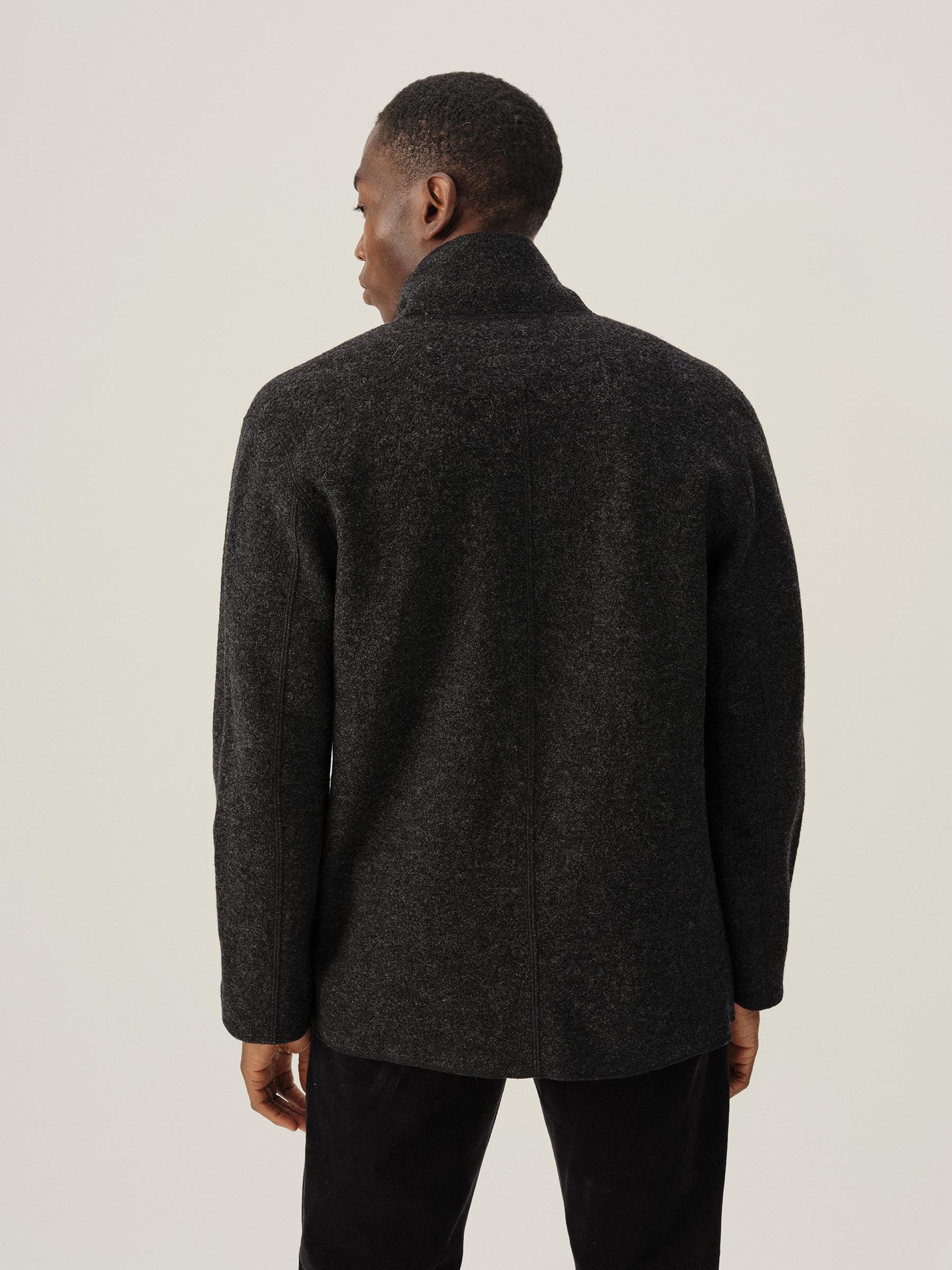 Classic fit chore coat with a slimmer cut through the arms and room in the torso for layering. This 340 GSM felted merino wool has been twice boiled for improved insulation and durability. Details include three patch pockets, real horn buttons, and a notch collar. Constructed with hand-sewn facings and cover-stitching throughout.