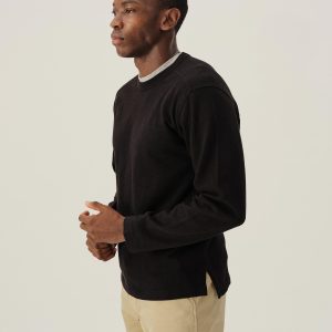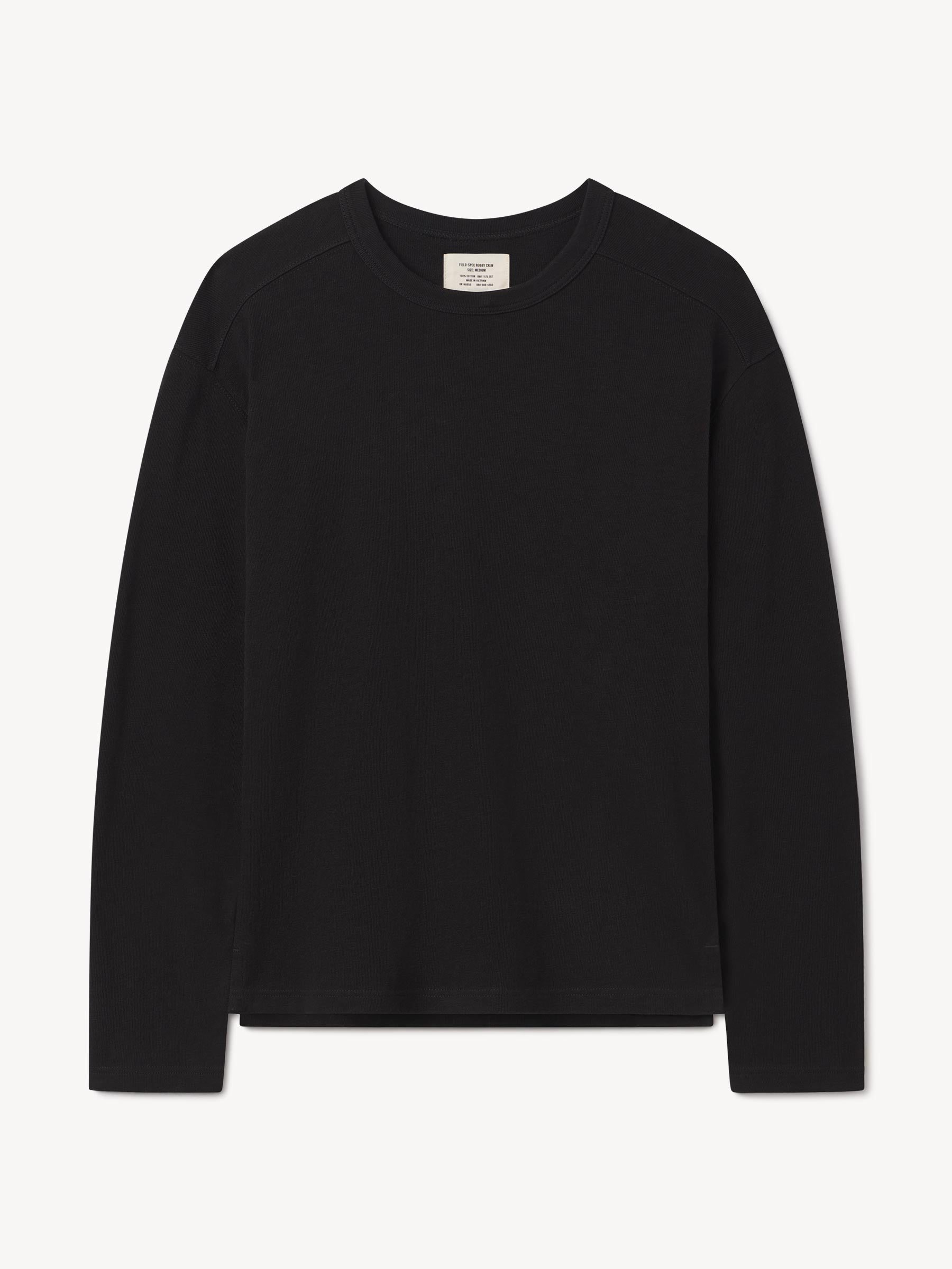A relaxed, long-sleeved, heavyweight cotton tee modeled after a vintage rugby shirt. The soft cotton jersey is about twice as heavy as our Pima tee, with tiny vertical ribs that gently glide across the skin. This is a solid, substantial stand-alone tee for cold weather.