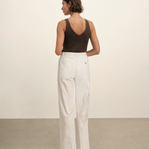 Slim-fit, vintage-inspired V-neck tank crafted from 100% Italian cotton yarn with a 3×3 deep rib structure. Designed with concealed chain threads and snaps beneath each shoulder to keep bra straps in place. Garment washed for a truly vintage, broken-in feel.