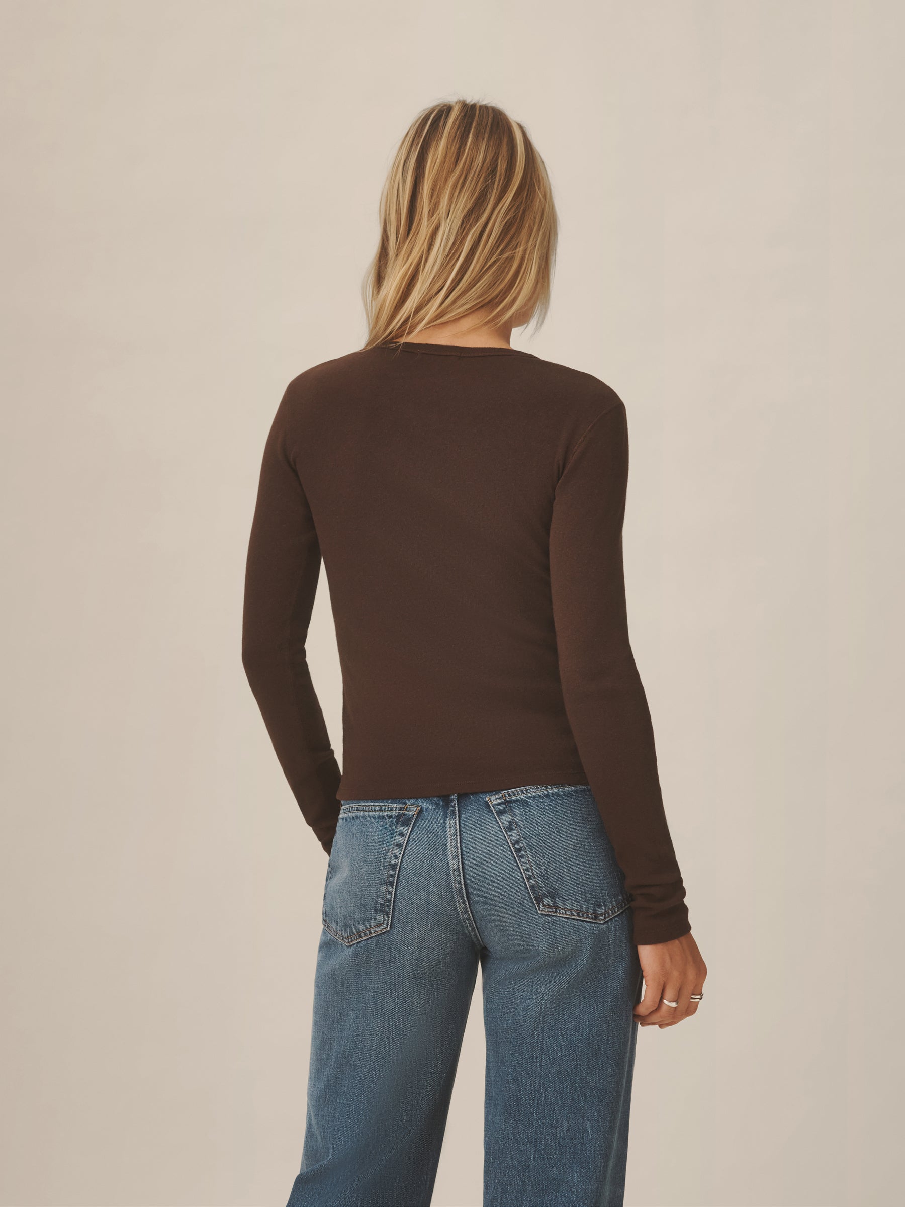 “Slim fit long sleeve henley cut from extra fine 170 GSM cotton with recycled content that holds its shape. Details include a a three-button loop placket with corozo fish eye buttons, and straight, clean finished hem and cuffs. Garment washed for a lived-in feel.