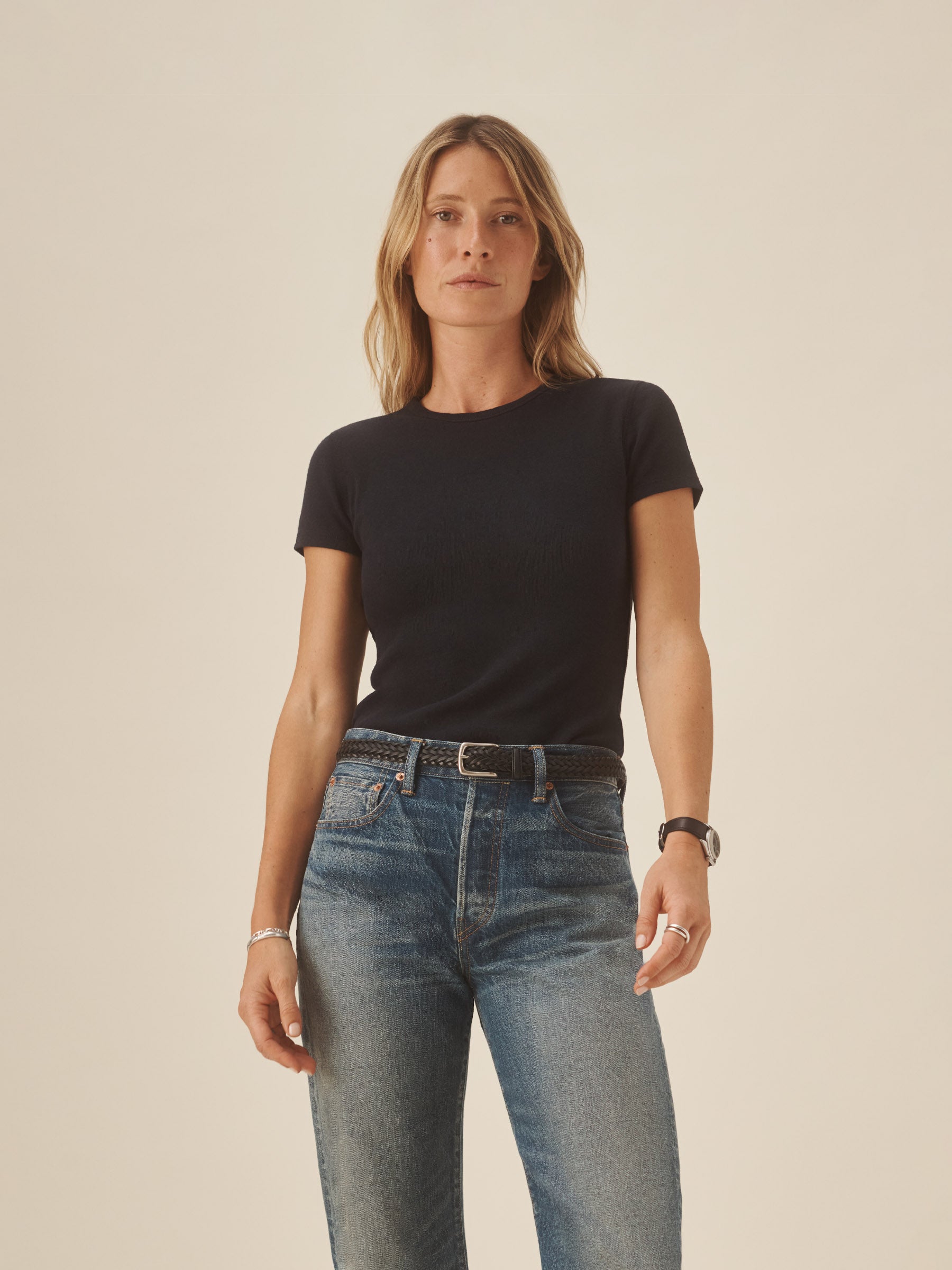 Our take on the classic baby tee, crafted from a superfine blend of new and recycled cotton with a subtle, textured rib. Garment washed for a lived-in look and feel.