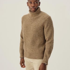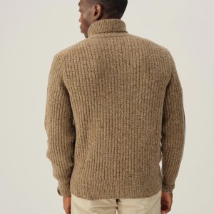 Classic fit long sleeve turtleneck sweater in light and breathable 9-gauge Italian yarn-dyed wool blend finely knit in a ribbed pattern with multicolor flecks reminiscent of Donegal tweeds. Constructed with fashioning at the shoulder and armhole and finished with a ribbed collar, cuffs, and hem. Lightly brushed for a softer hand.
