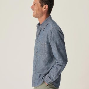 Classic fit work shirt cut from 5 oz indigo yarn-dyed chambray. Details include tonal buttons, two chest pockets, and run off stitching at the side gussets. Constructed with clean finished seams. Garment washed for a lived-in look and feel.