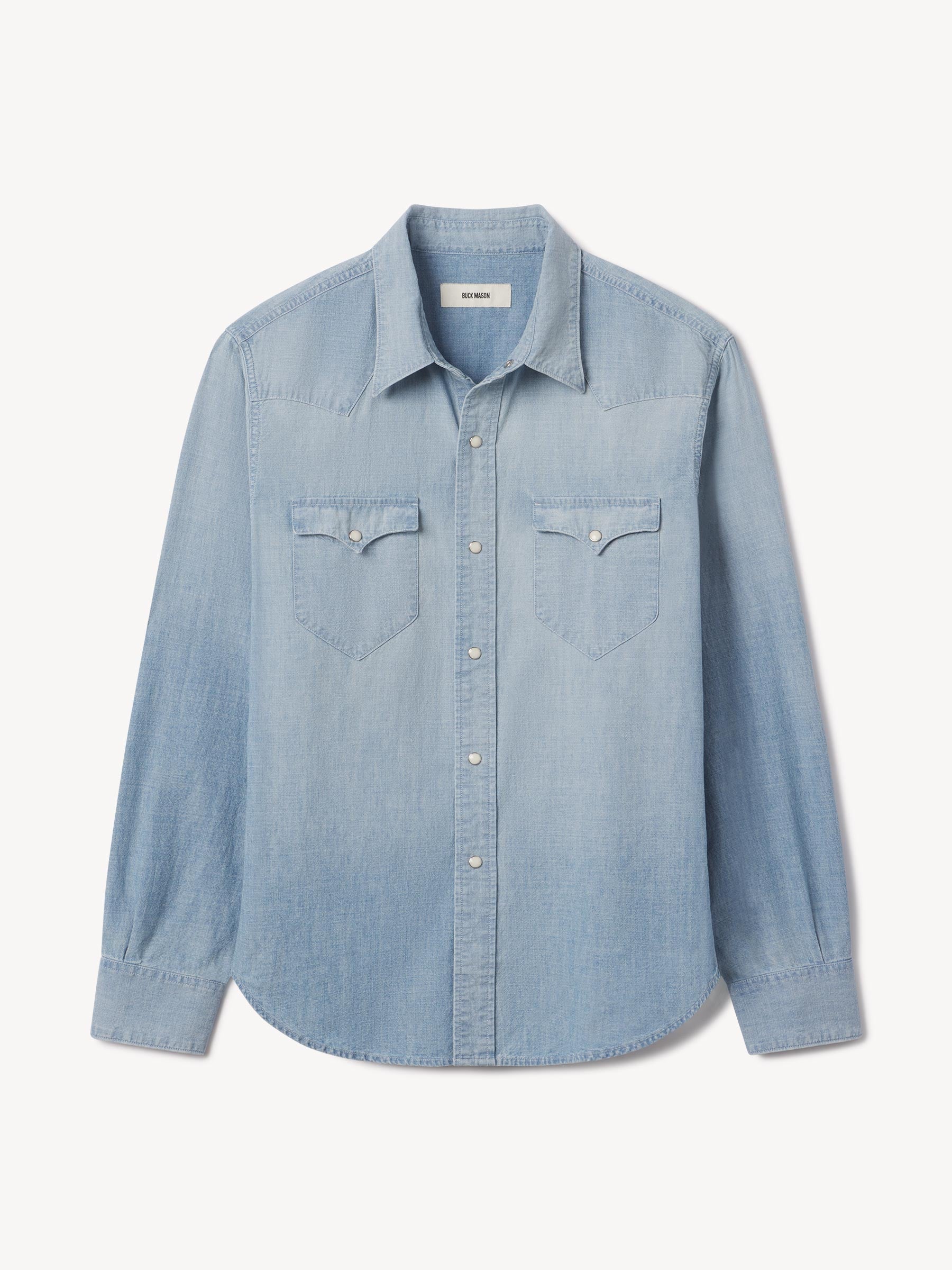 A classic western-style workshirt in a washed cotton chambray. The shirt has all cowboy details like pearl snap closures, curved western yoke, scalloped flap pockets, and three snaps along the cuffs. The blue chambray cotton has been washed for a lived-in feel.