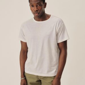 Crafted from a custom-spun, super fine 56 singles blended cotton-linen yarn, spun and knit exclusively in Japan. This fabric is designed to combine the smoothness of a premium yarn with the subtle texture of something more rugged. The result is a tee that’s smooth, cool, and light as air with a subtle silky hand feel. Finished with a rib-bound crewneck, blind hems at the sleeves and bottom, and overlocked seams.