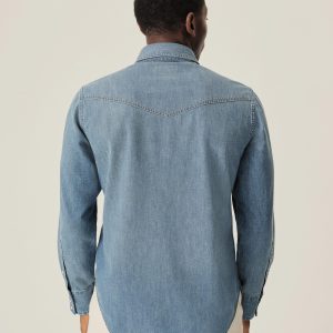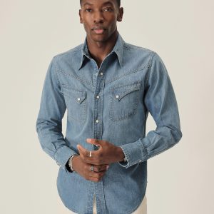 A slim fitting, tailored take on western shirts from the early 1950s. The angled front yoke, extending all the way to the center front placket reinforces the top half, just as it did for ranchers and cowboys. Constructed with felled seams and chain stitching to enhance strength and durability. Finished with pearl snaps and a wash that carefully details the character and texture of a decades old classic.