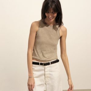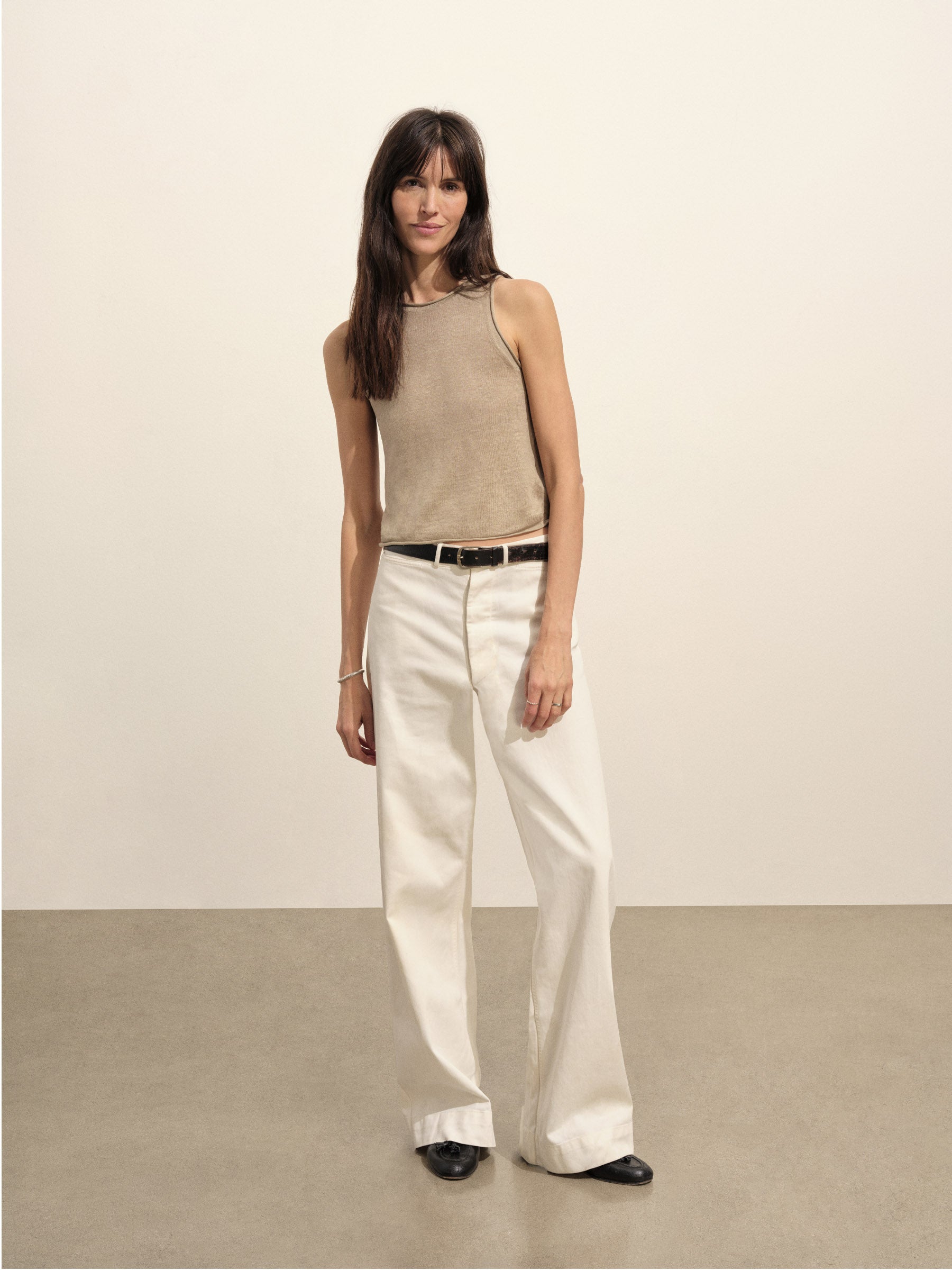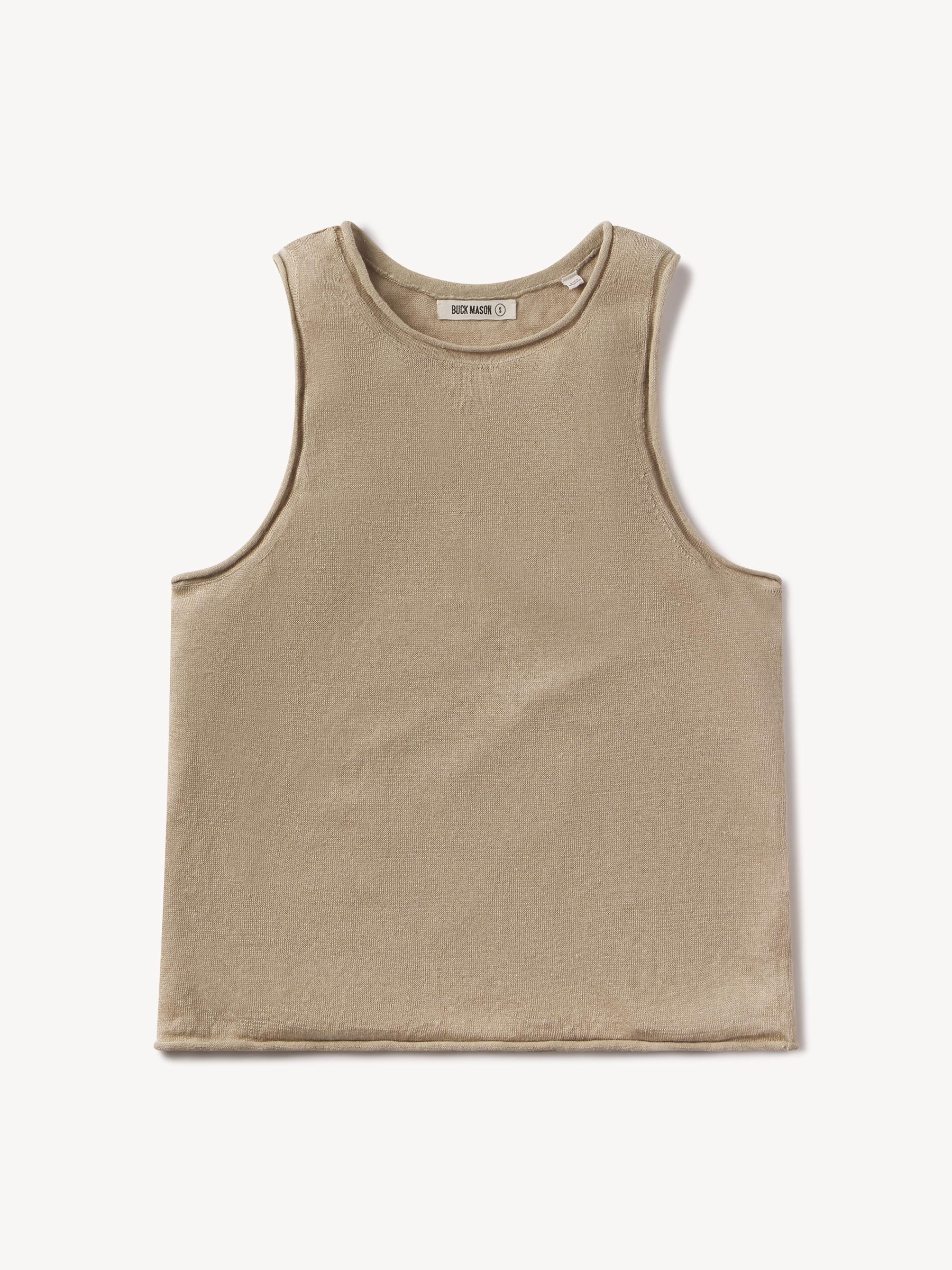 Oversized rollneck sweater-tank knit from textured linen, featuring a high neckline and a concealed thread-chain and snaps at each shoulder to hold bra straps in place. Garment washed for a soft, textured feel.