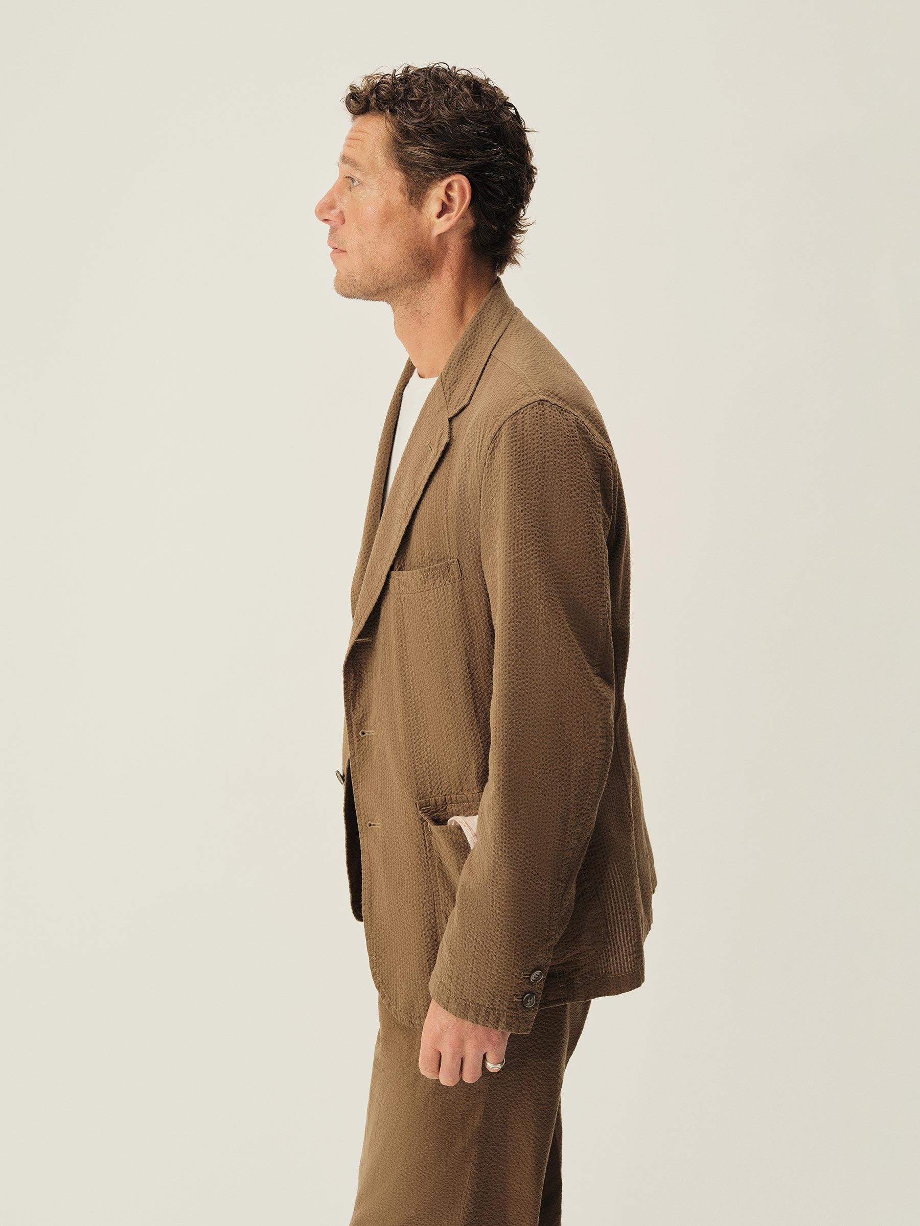 Tailored 3-roll-2 button blazer inspired by timeless vintage suiting. This 5 oz cotton seersucker has a rippled texture that wicks moisture and maintains airflow making it ideal for warmer climates. Details include two patch pockets, two internal welt pockets, and a notched lapel. We left it unlined and omitted the back vent and cuff buttons for a casual, streamlined look. Constructed with hand-linked seams and garment washed with enzymes and softener for a lived-in feel.