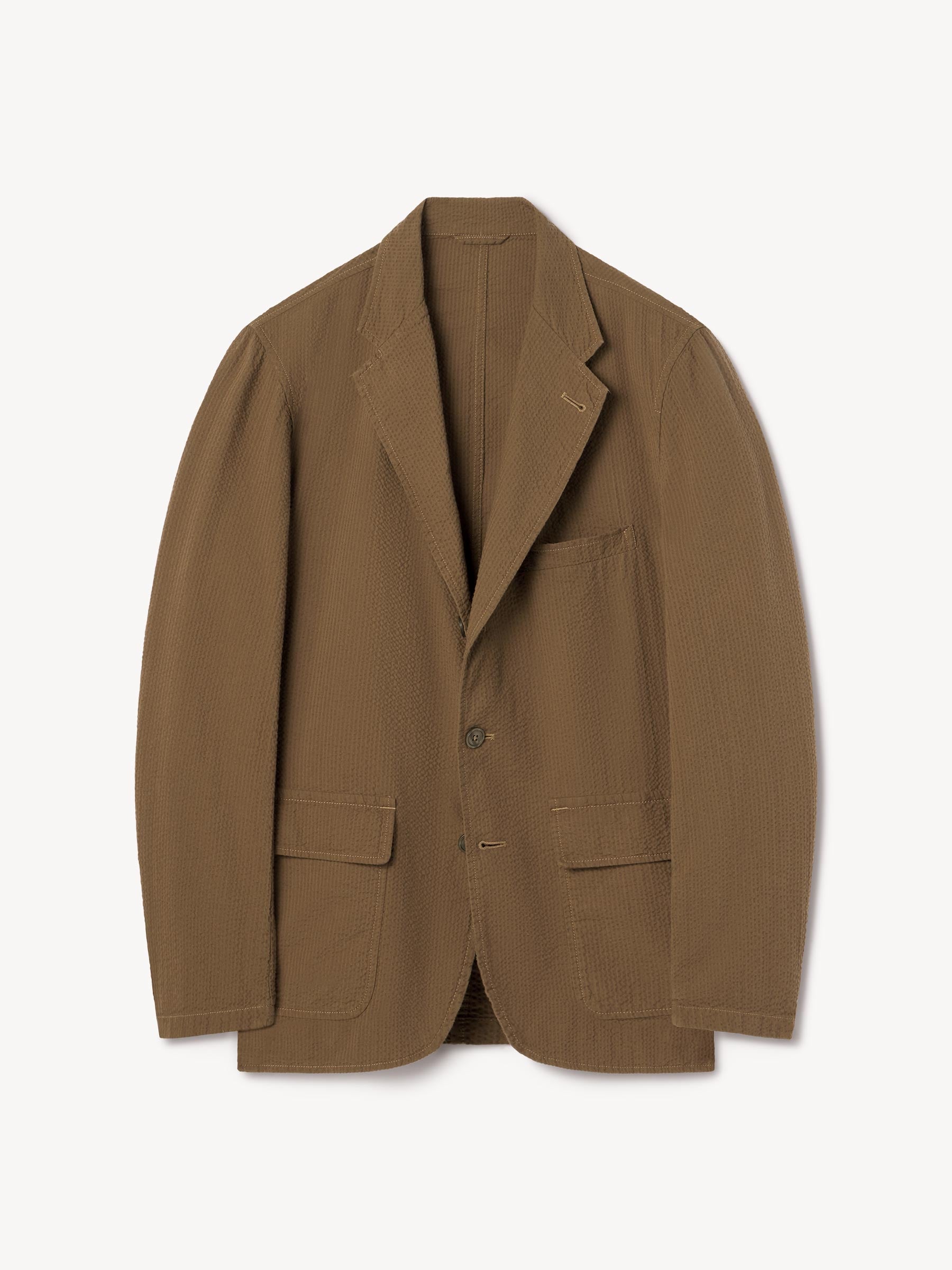 Tailored 3-roll-2 button blazer inspired by timeless vintage suiting. This 5 oz cotton seersucker has a rippled texture that wicks moisture and maintains airflow making it ideal for warmer climates. Details include two patch pockets, two internal welt pockets, and a notched lapel. We left it unlined and omitted the back vent and cuff buttons for a casual, streamlined look. Constructed with hand-linked seams and garment washed with enzymes and softener for a lived-in feel.