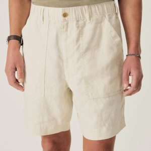 Classic fit fatigue short. This 7 oz. linen has a loose, airy weave that breathes easily, and it’s been washed for a lived-in feel. Details include two front patch pockets, two back patch pockets, an encased elastic waist with drawcord, and corozo buttons. Garment washed with enzymes and softener for a lived-in feel. Button and zip closure.