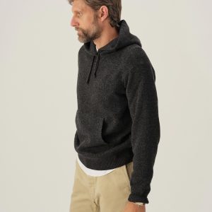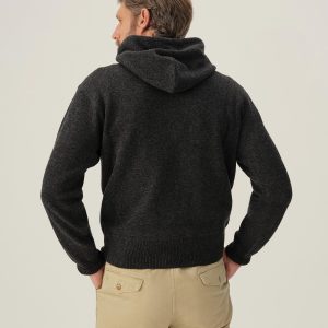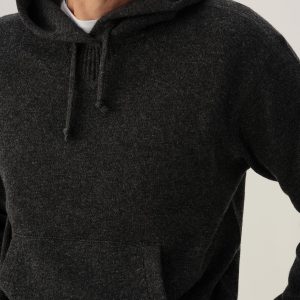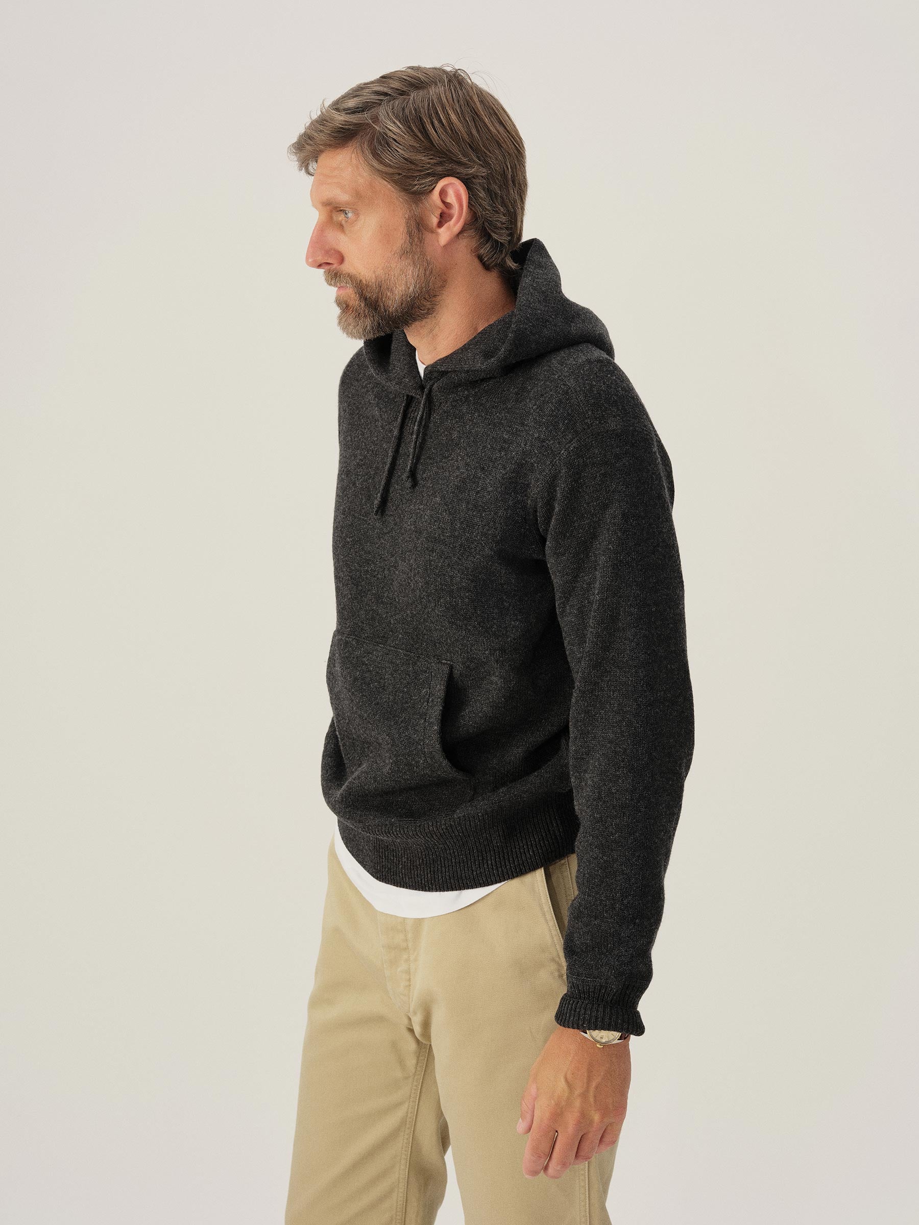 Classic fit hooded sweater in a 9 gauge plaited jersey knit with a merino wool/cashmere face and looped merino wool back. Features a kangaroo pocket and ribbing at the cuffs and hem. Constructed with hand-linked seams for durability.