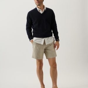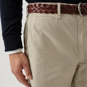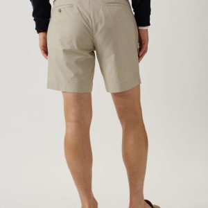 Easy tailored officer short with a tapered leg and 6.5″ inseam. This 5.5 oz. cotton poplin has a crisp hand and light structure suitable for warmer climates. Vintage army chino-inspired details include a Hollywood waistband, slash hip pockets, two single welt back pockets (one of which has a button closure), and a single welt coin pocket. Garment washed with enzymes and softener for a lived in feel. Zip fly with waist button closure.