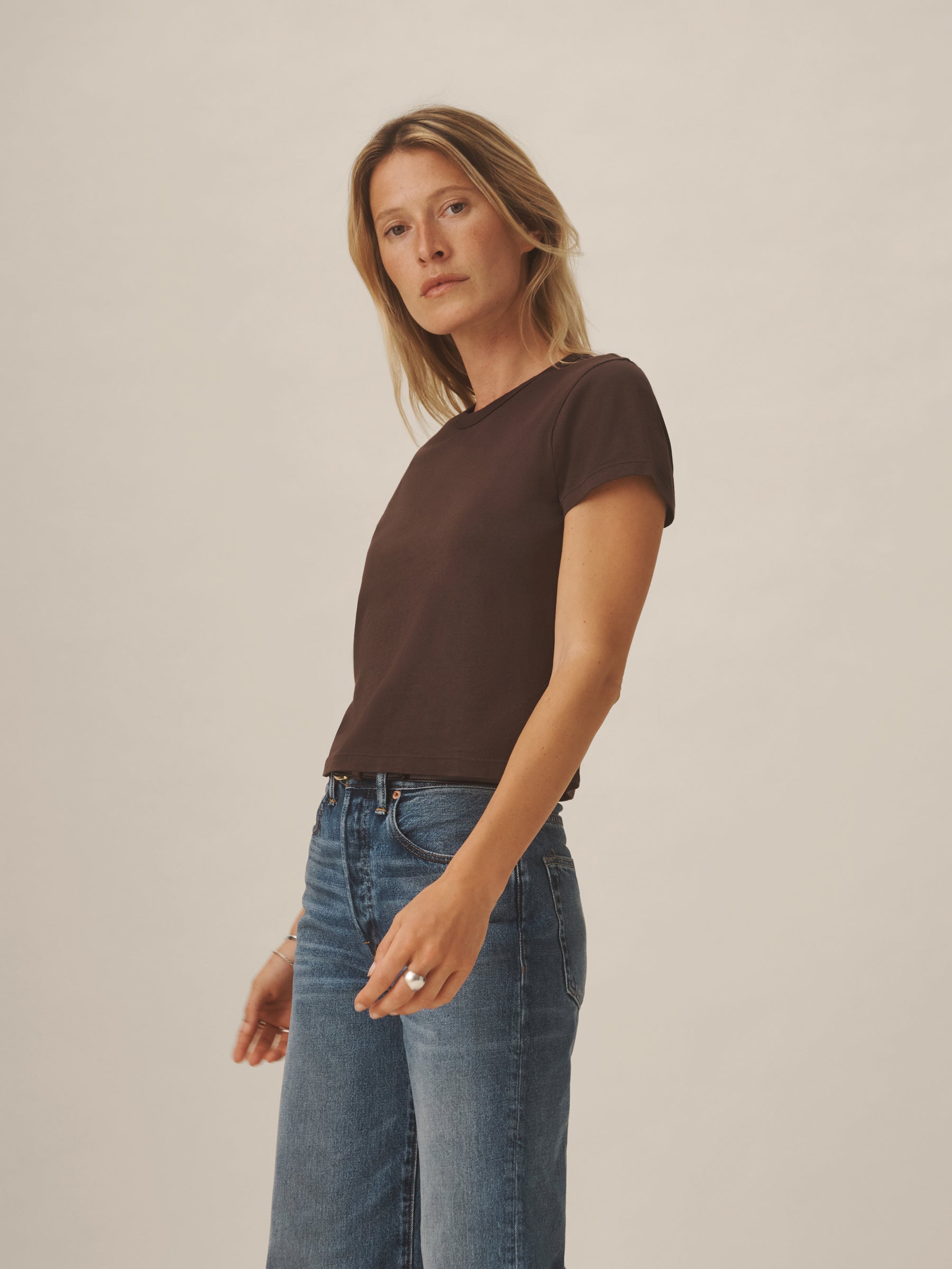 Boxy short sleeve crewneck tee with a straight hem. Cut from 120 GSM Supima cotton. Constructed with rib neck binding and double-needle cover-stitching at the hem. Garment washed for a lived-in feel.