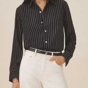 A modern take on men’s sportswear shirts from the 1940s, a relaxed button-down shirt in a silky rayon jacquard weave. Featuring a carved collar, side-seam gussets, button-through plackets along shirt front and sleeves, and pintuck detailing on back yoke and sleeve cuffs. Finished with side-seam gussets and mother of pearl buttons.