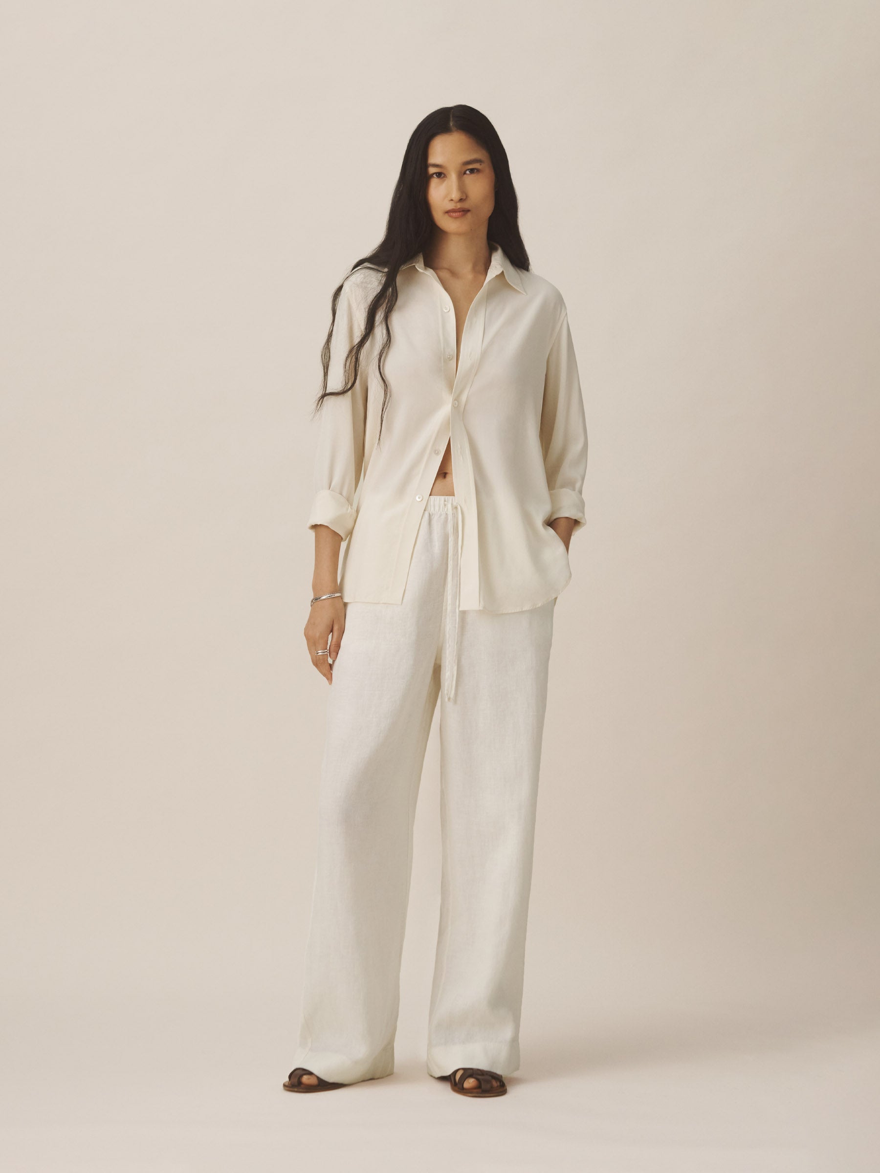 A modern take on men’s sportswear shirts from the 1940s, a relaxed button-down shirt in a silky rayon jacquard weave. Featuring a carved collar, side-seam gussets, button-through plackets along shirt front and sleeves, and pintuck detailing on back yoke and sleeve cuffs. Finished with side-seam gussets and mother of pearl buttons.