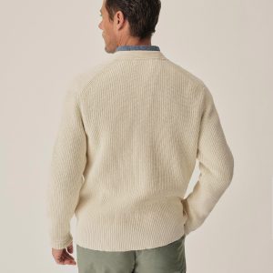 Classic fit fisherman’s cardigan sweater in a homespun textured cotton rib with two patch front pockets and a 5-button front closure. Constructed with hand-linked seams, double layer ribbing at the front placket, and racking stitch detailing at the cuffs.
