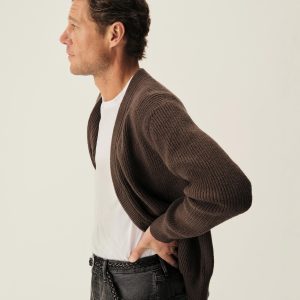 Classic fit fisherman’s cardigan sweater in a homespun textured cotton rib with two patch front pockets and a 5-button front closure. Constructed with hand-linked seams, double layer ribbing at the front placket, and racking stitch detailing at the cuffs.