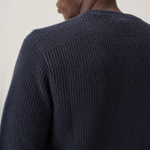 Classic fit crewneck sweater in a homespun textured cotton rib. Constructed with hand-linked seams, double layer ribbing at the collar, and racking stitch detailing at the cuffs.