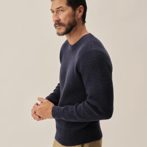 Classic fit crewneck sweater in a homespun textured cotton rib. Constructed with hand-linked seams, double layer ribbing at the collar, and racking stitch detailing at the cuffs.