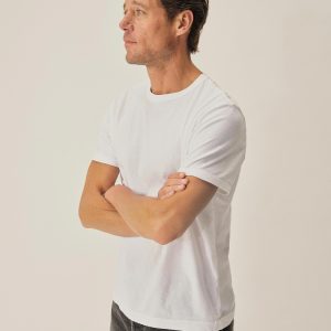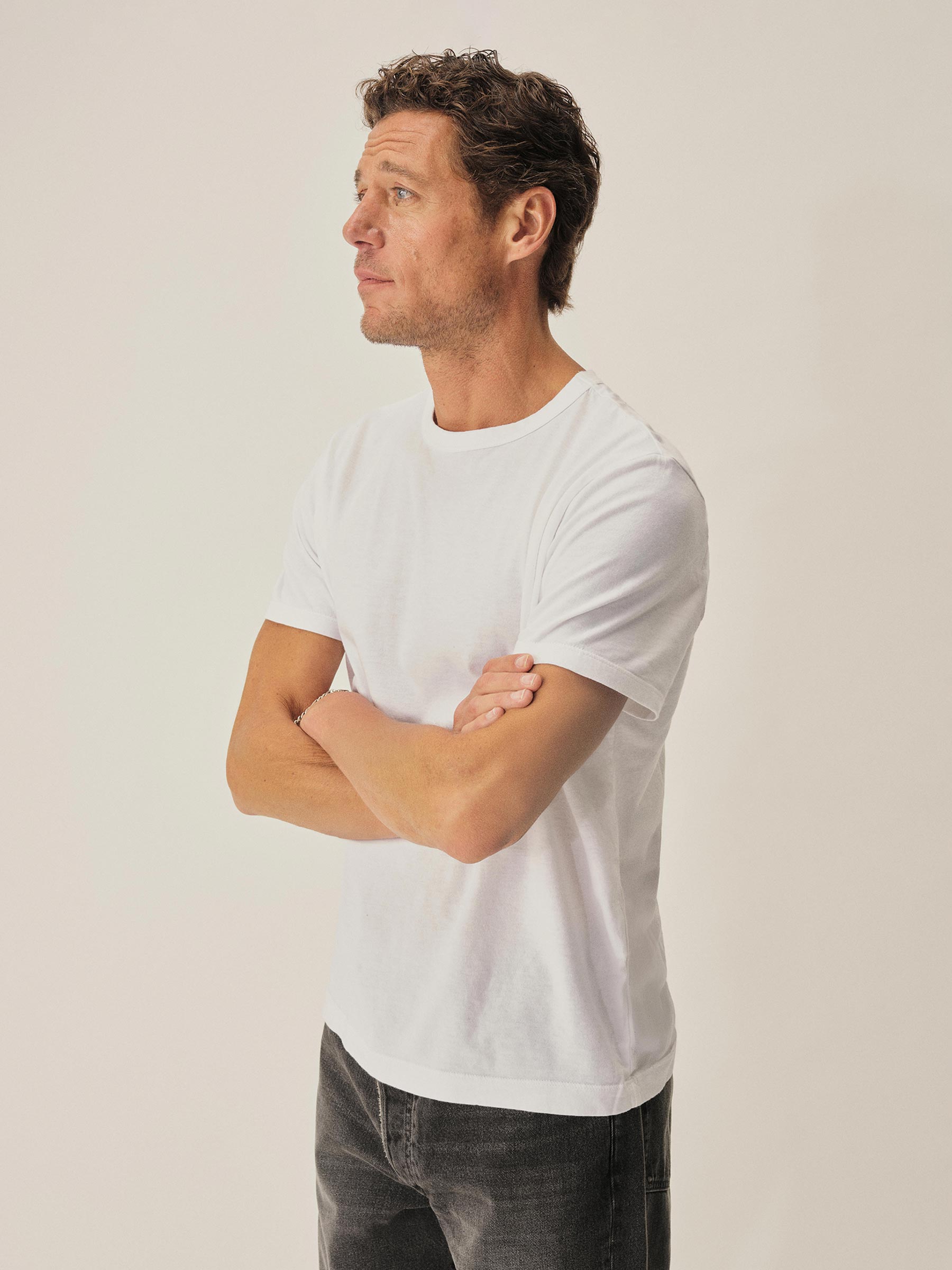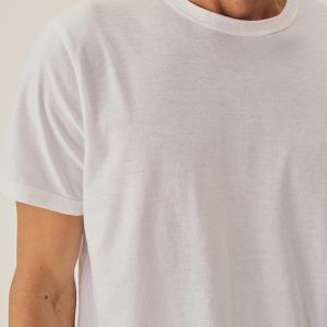 Classic fit short sleeve crewneck tee with a straight hem. Cut from USA-grown 145 GSM cotton jersey with a light slub texture and sewn at BM Knitting Mills in Mohnton, PA. Garment washed with enzymes and softener for a lived-in feel.