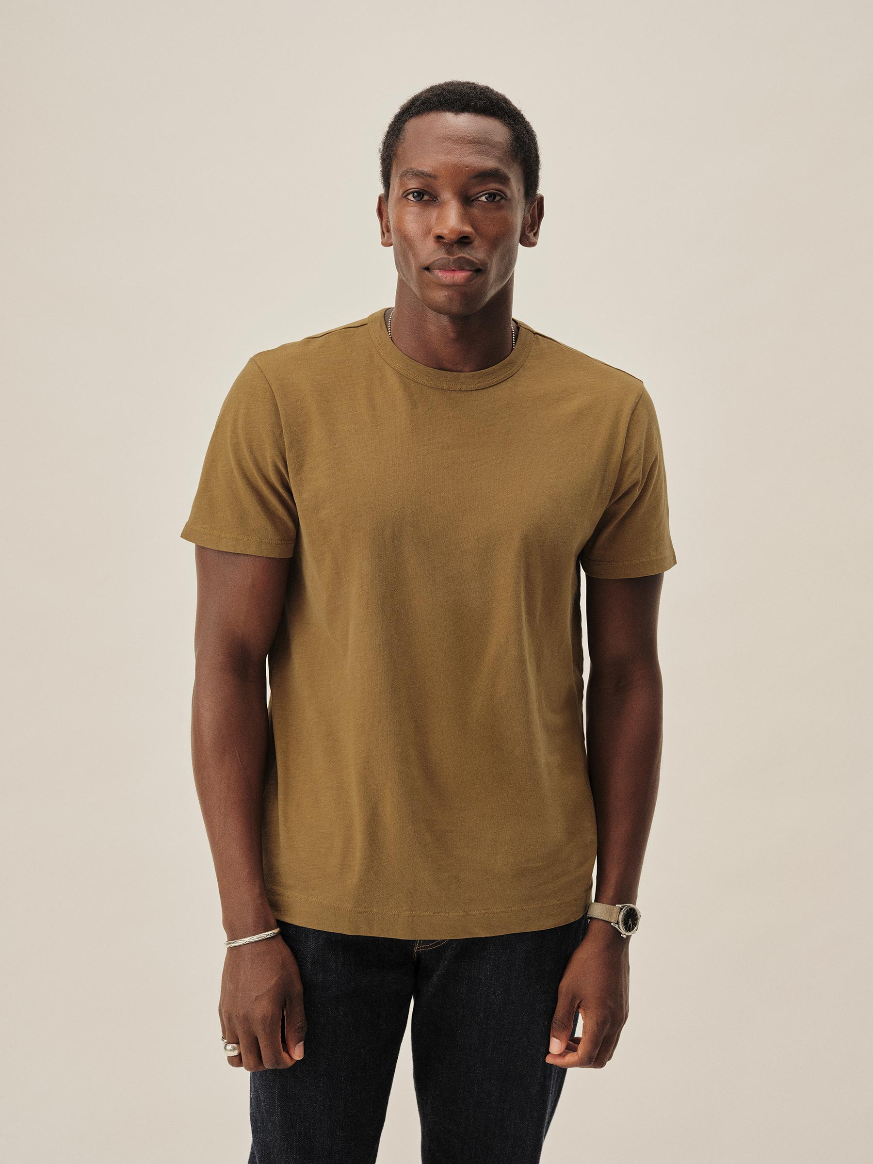 Classic fit short sleeve crewneck tee with a straight hem. Cut from USA-grown 145 GSM cotton jersey with a light slub texture and sewn at BM Knitting Mills in Mohnton, PA. Garment washed with enzymes and softener for a lived-in feel.