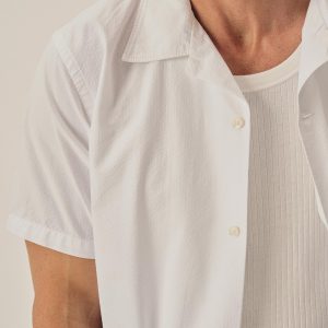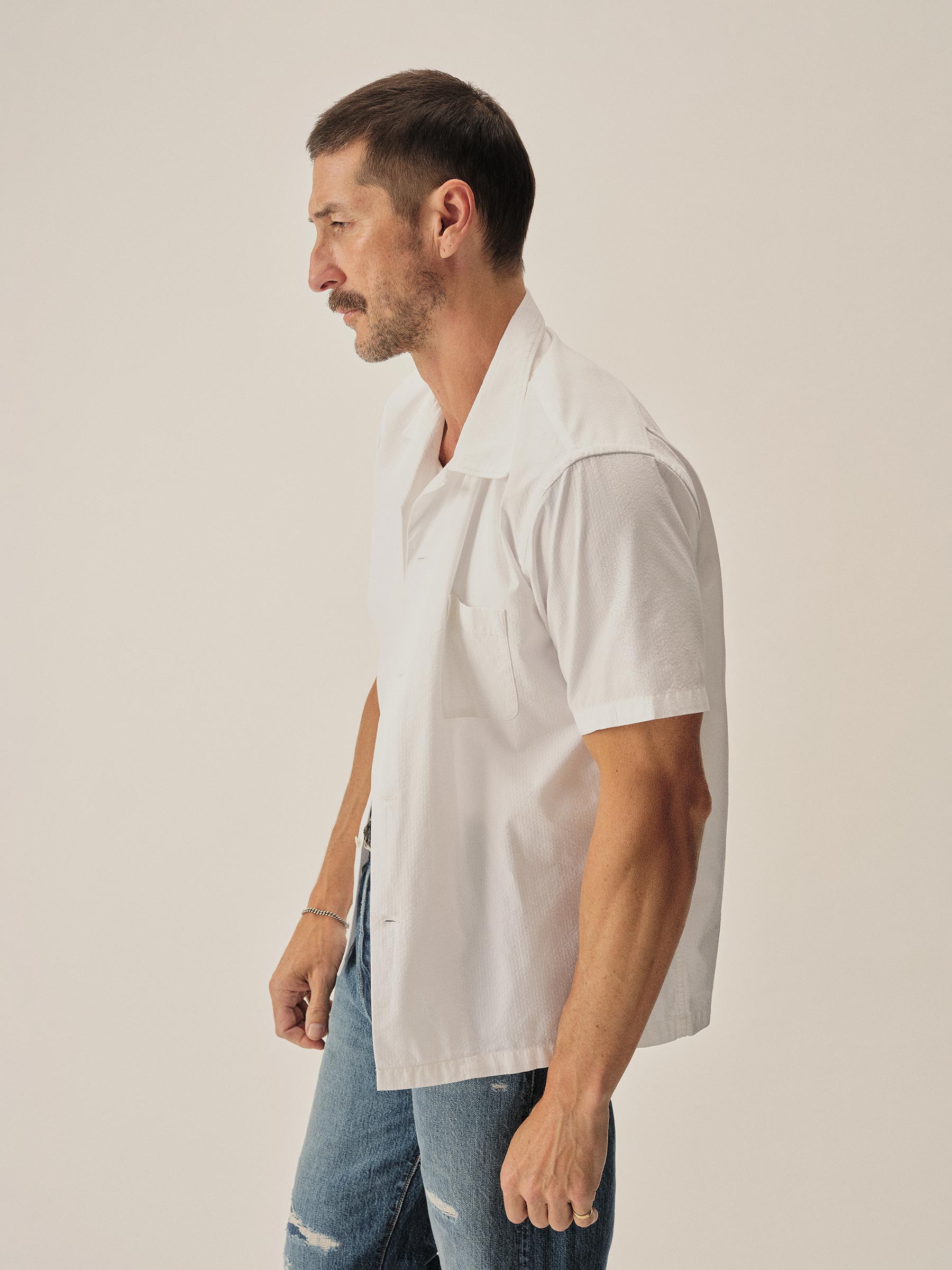 A light, airy seersucker camp shirt cut in a boxy fit with a straight hem. Features a one pocket construction and Mother of Pearl buttons.