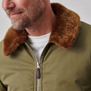 Classic fit, fully lined bomber jacket cut from a 5.5 oz. yarn-dyed cotton/poly twill with a durable water repellent finish. Details include angled flap hip pockets, ribbing at the collar, and articulated two-piece sleeves. Zip front closure. Insulated with PrimaLoft®.
