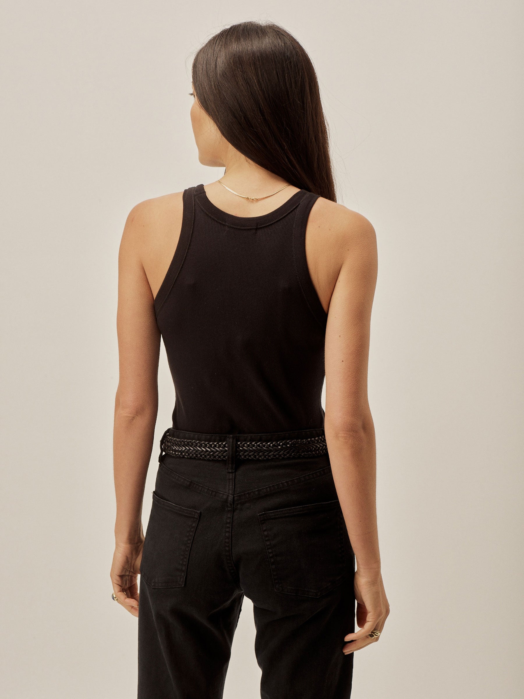 Slim fit, vintage military-inspired tank cut from 295 GSM stretch cotton that holds its shape. 2×2 rib structure—two rows of rib stitch, two rows of jersey stitch—is offset by contrast 1×1 ribbing at the neck. Features a hidden thread chain and snap at each shoulder to hold bra straps in place. Constructed with flatlock stitching throughout and double needle coverstitching at the hem. Garment washed for a lived-in feel.