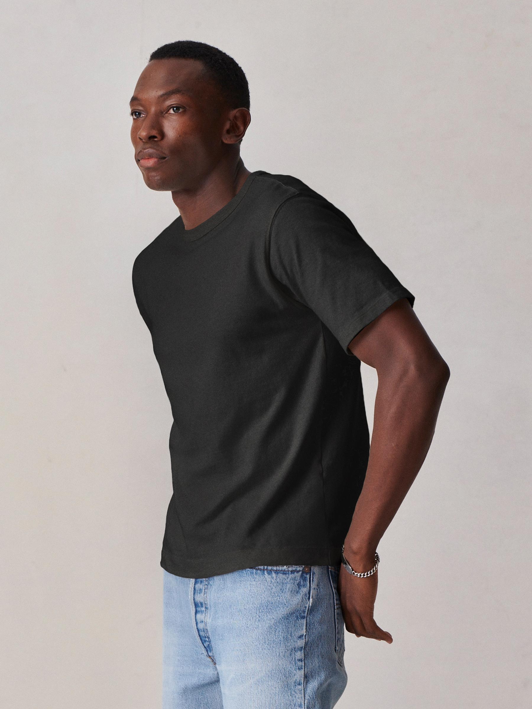 Cut from a midweight 200 GSM USA-grown cotton, developed, milled, and sewn at BM Knitting Mills in Mohnton, PA. This 90s-inspired boxy crewneck tee has a straight hemline, longer sleeves that hit lower on the bicep, and a wide ribbed collar. Bound neck and screen-printed label for comfort, constructed with a split-needle cover stitch at shoulders and armholes. Double-washed for a soft, smooth texture and consistent fit.