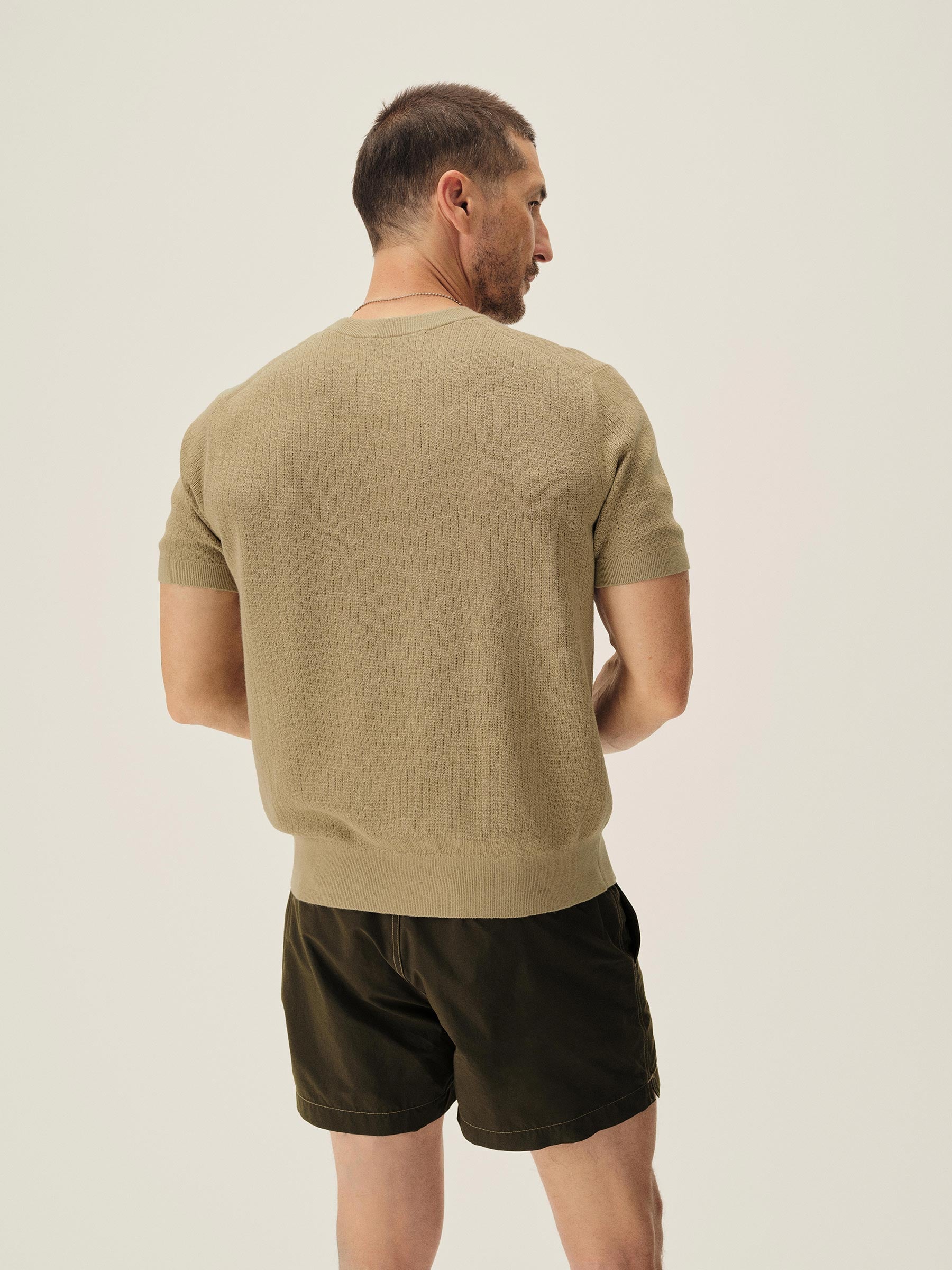 A classic fit tee in a fine knit drop-needle rib construction. Made from 12 gauge yarn-dyed hemp/cotton blend that wicks moisture and breathes easily. Chest pocket with ribbed opening. Finished with a 1×1 rib at collar, cuffs and waistband. A versatile summer layer inspired by vintage rib tees.